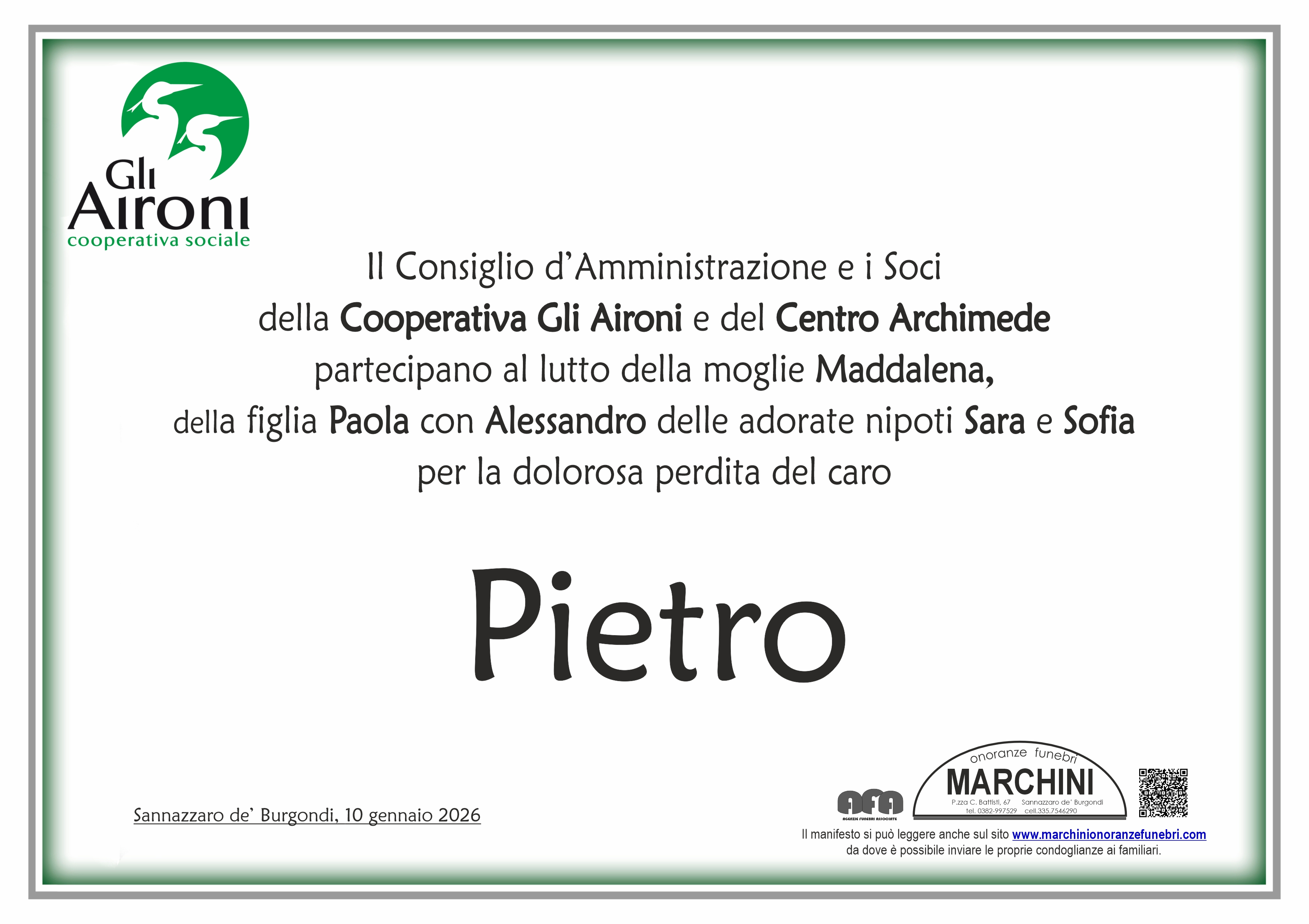 Incredule e profondamente addolorate partecipiamo commosse al vostro dolore, vi stringiamo in un affettuoso abbraccio e porgiamo le nostre più sincere condoglianze, elevando al Signore una preghiera per Piero e per tutti voi affinché possiate trovare conforto sostegno e consolazione in questo tristissimo momento. Pinuccia e Gabriella Sacchi