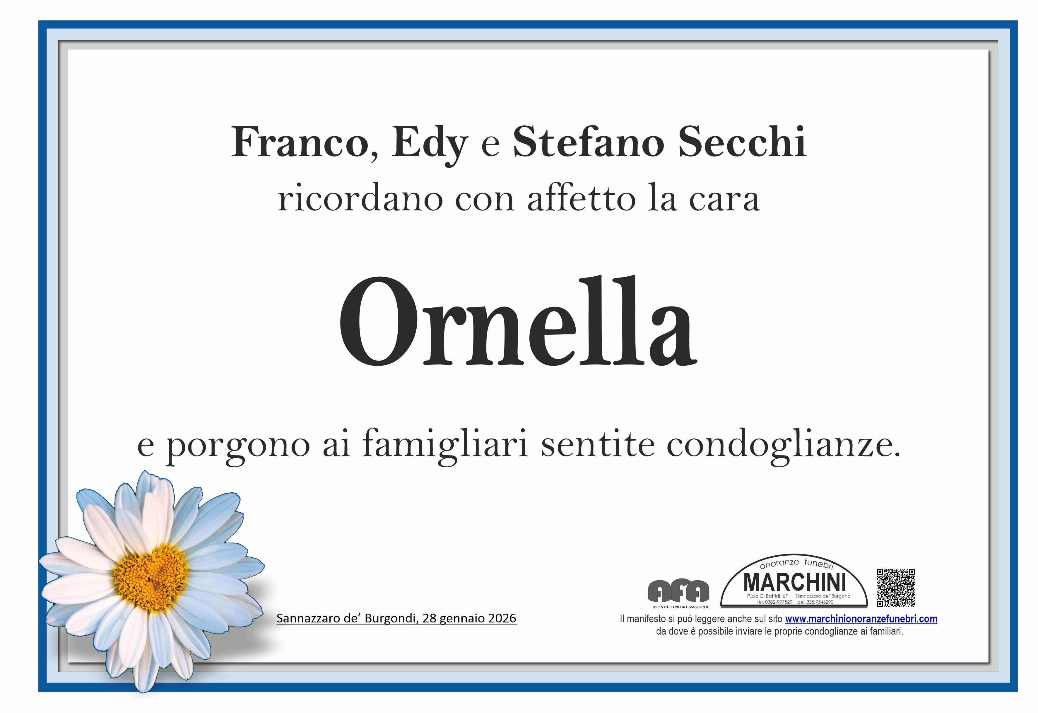 Ricordiamo la simpatia della cara Ornella e porgiamo sentite condoglianze alla famiglia.le ex colleghe del cup di Mede Mirella Rossi Collosi Giulia Manfredi Pinuccia Rizzato Marilena Donato Rosanna